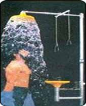 The shower delivers an overhead spray of water that drenches the user in seconds.