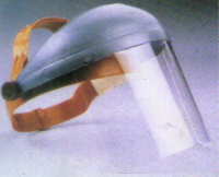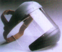 Face shield with adjustable headband, visor supported by vulcanized fibre/PVC strip with cushioned sweatband and brass fly wings. Sizes: 6" * 9", 9" * 9", 9" * 12" Available in Clear, Blue and Green visor.